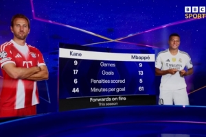BBC统计凯恩、姆巴佩本赛季数据: