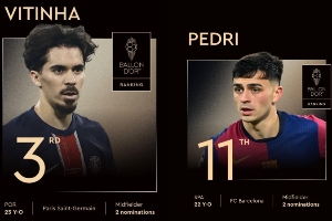 体育资讯10月02日讯 欧冠联赛阶段第2轮,巴萨主场1-2遭巴黎逆转绝杀,今年金球排名第11的佩德里(22岁)和金球排名第3的维蒂尼亚(25岁)均首发出战。