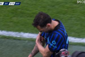 体育资讯01月12日讯 国米vs那不勒斯第87分钟,恰尔汗奥卢无法坚持坐地上了,之后他下场,苏契奇登场!